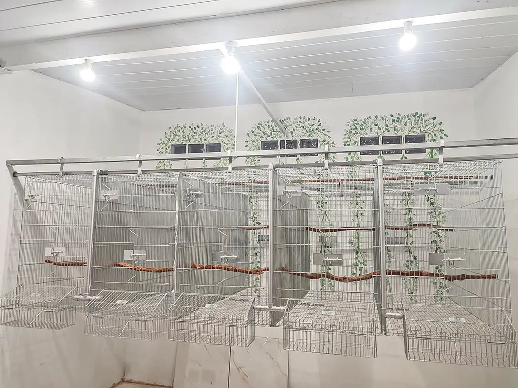 Gaiola criadeira profissional para canários com dimensões de 43x26x34 cm. Equipada com quatro comedouros, quatro poleiros de madeira e bandeja removível, é a solução completa para criadores que buscam um ambiente seguro e prático para a reprodução de aves.