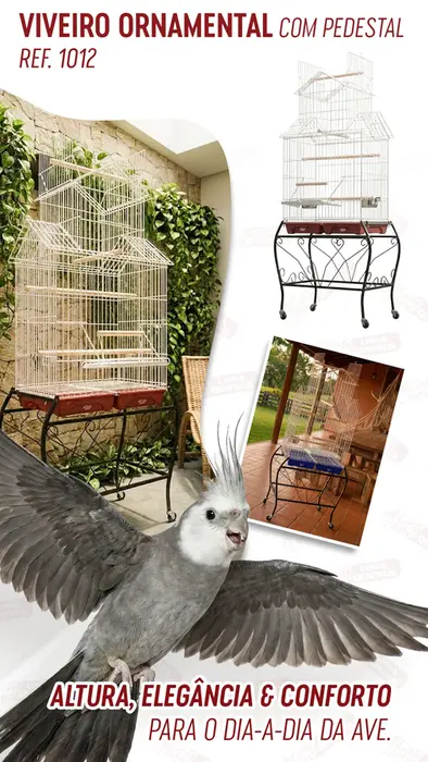 Gaiola modelo Duplex para Calopsita com design em arco e abertura frontal funcional. Possui dimensões de 43x25x45 cm, estrutura em aramado resistente e inclui poleiros de madeira, comedouros e bandeja removível. É a solução ideal para quem busca um habitat compacto com recursos extras de interação e facilidade de limpeza.