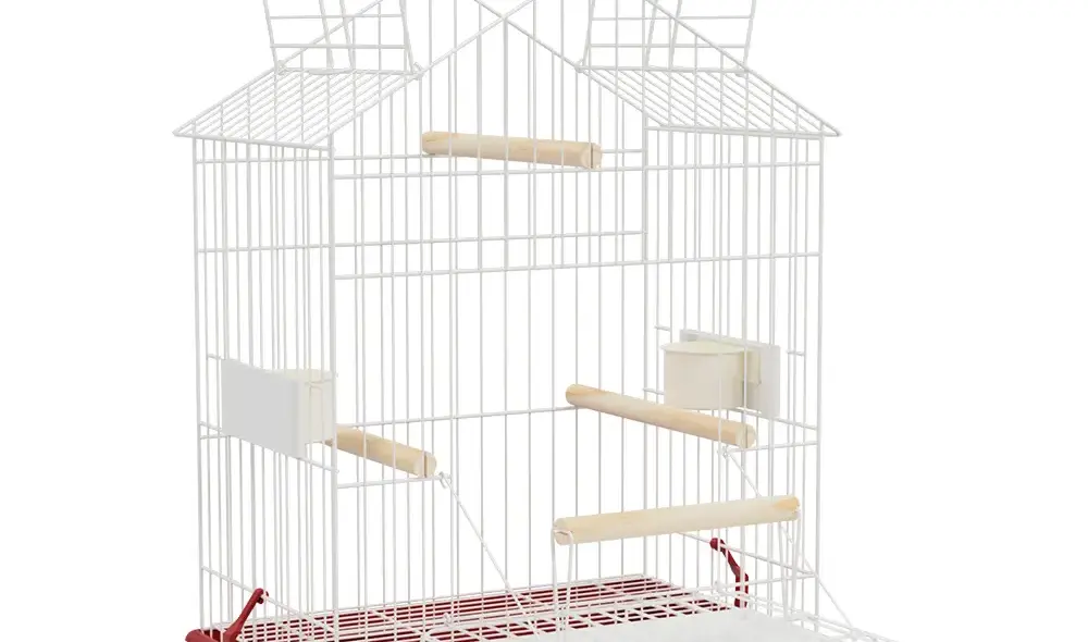Gaiola modelo Capela para Calopsita (37x23x54 cm) com teto duplo estilizado e poleiro externo superior. Possui abertura frontal funcional tipo plataforma, estrutura em aramado resistente e base plástica de fácil manutenção, oferecendo um ambiente rico em estímulos e conforto para seu pet.