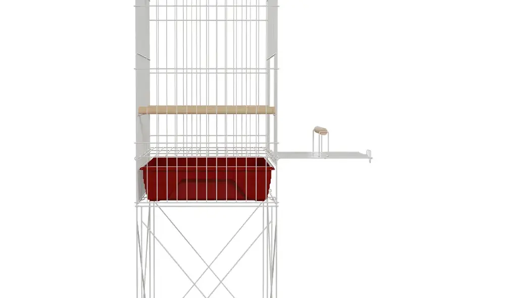 Viveiro vertical dobrável com suporte elevado e dimensões de 44x30x102 cm, ideal para calopsitas. Equipado com varanda frontal, três poleiros e fundo removível, une amplo espaço interno com facilidade de manutenção e segurança.