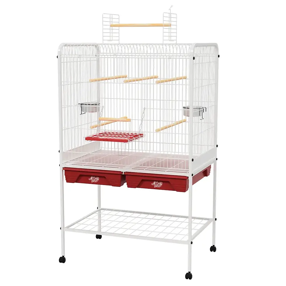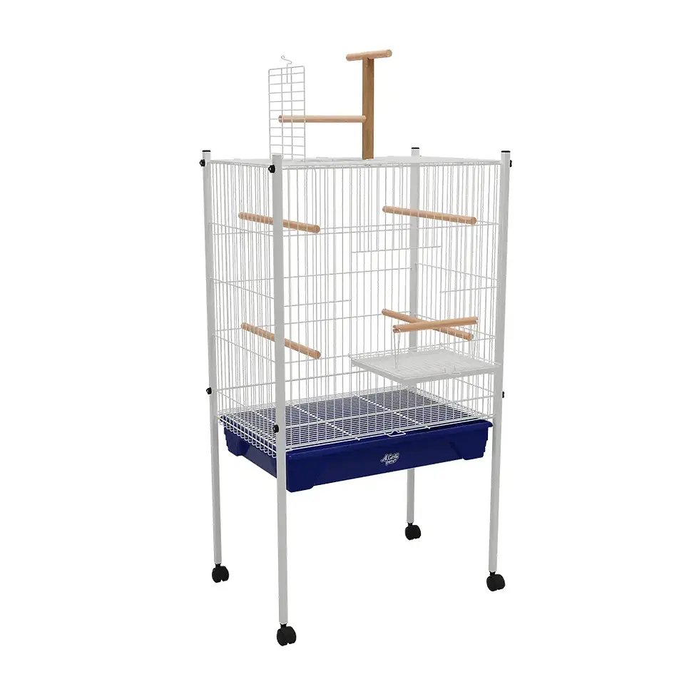 Viveiro Inglês GRD para papagaios com largura ampliada de 80 cm, equipado com rodízios, área de lazer no teto e varanda frontal. Oferece espaço interno superior e sistema de bandejas duplas para facilitar a limpeza, sendo a solução mais robusta e completa da linha para grandes aves.